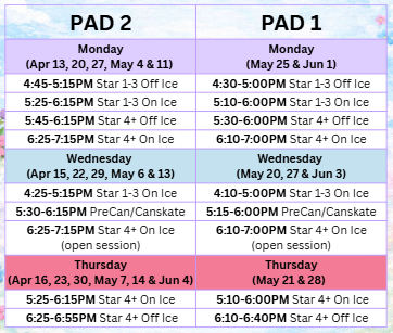 PLEASE NOTE: Ice Pad and Session Time Changes throughout the Spring Season